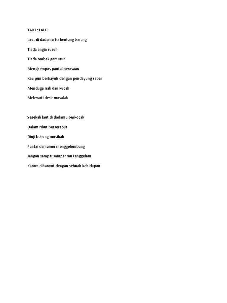 Dengan sajak kutitipkan rindu laut pada pantai yang menggaramkan buihnya 35. Aku mendengar lagu sajak Indonesia - Soekarno Dengan sajak kularutkan mimpi embun pada awan yang merelakan hujannya - Jamal T. Ibarat air laut di pantai meski ia kadang pasang dan surut.