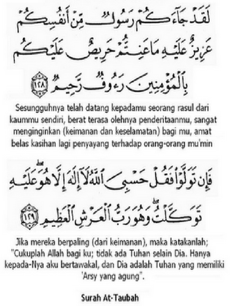 Quran Surat At-taubah 128-129 Laqod ja akum Bacaan Arab latin dan terjemahannya. Tapi ayat 129 masih satu kesatuan dalam arti. Novi Amanah November 25 2020.
