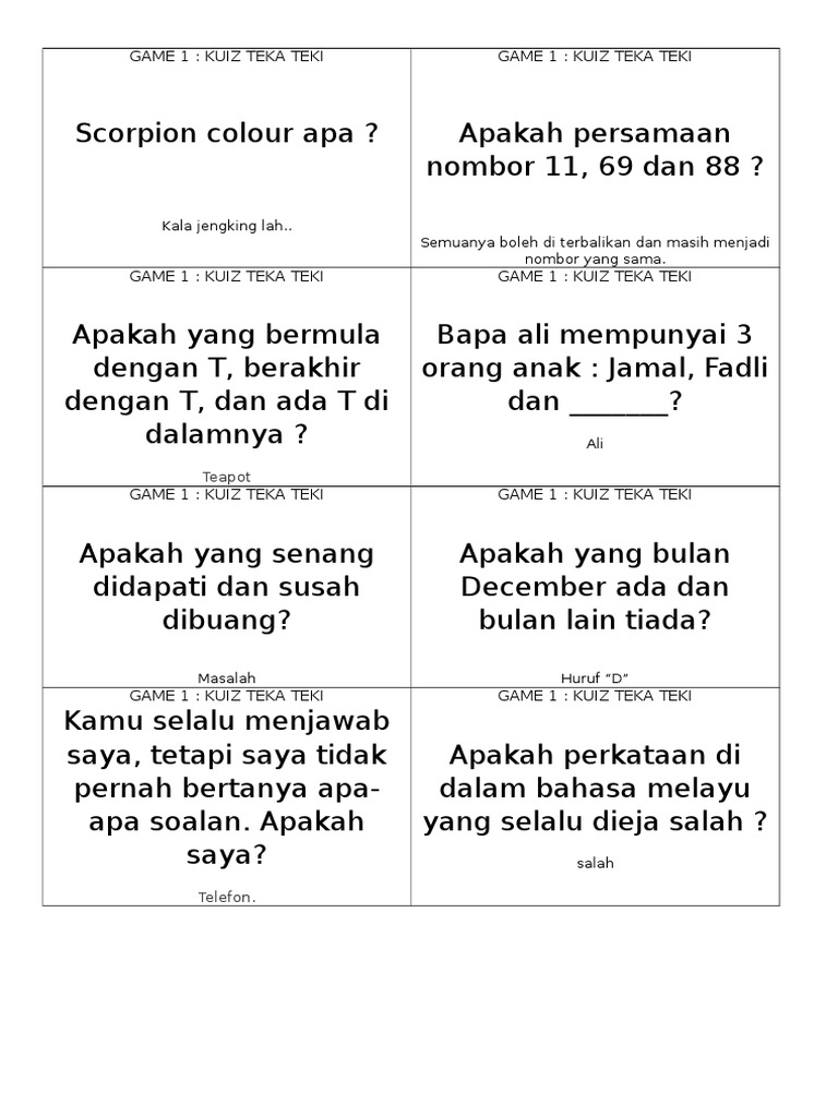 Senarai Contoh Teka Teki Susah Serta Jawapan Yang Menarik. Ini juga memungkinkan mereka untuk meningkatkan pengetahuan umum keterampilan kognitif memori konsentrasi dan pemecahan masalah.