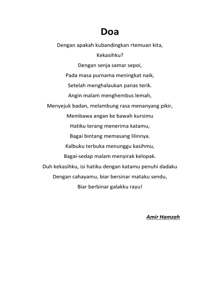 Ibuku dehulu marah padaku. Puisi Amir Hamzah DOA - puisi yang berjudul DOA karya Amir Hamzah memiliki makna yang bisa di bilang mendalam terbukti dengan Diksi yang berhati-hati ini menekankan kata-kata sederhana sebagai unit dasar dan sesekali menggunakan aliterasi dan asonansi. Bagaimana penggunaan diksi citraan kata konkret bahasa figuratif tema dan amanat dalam puisi Nyanyi Sunyi karya Amir Hamzah.