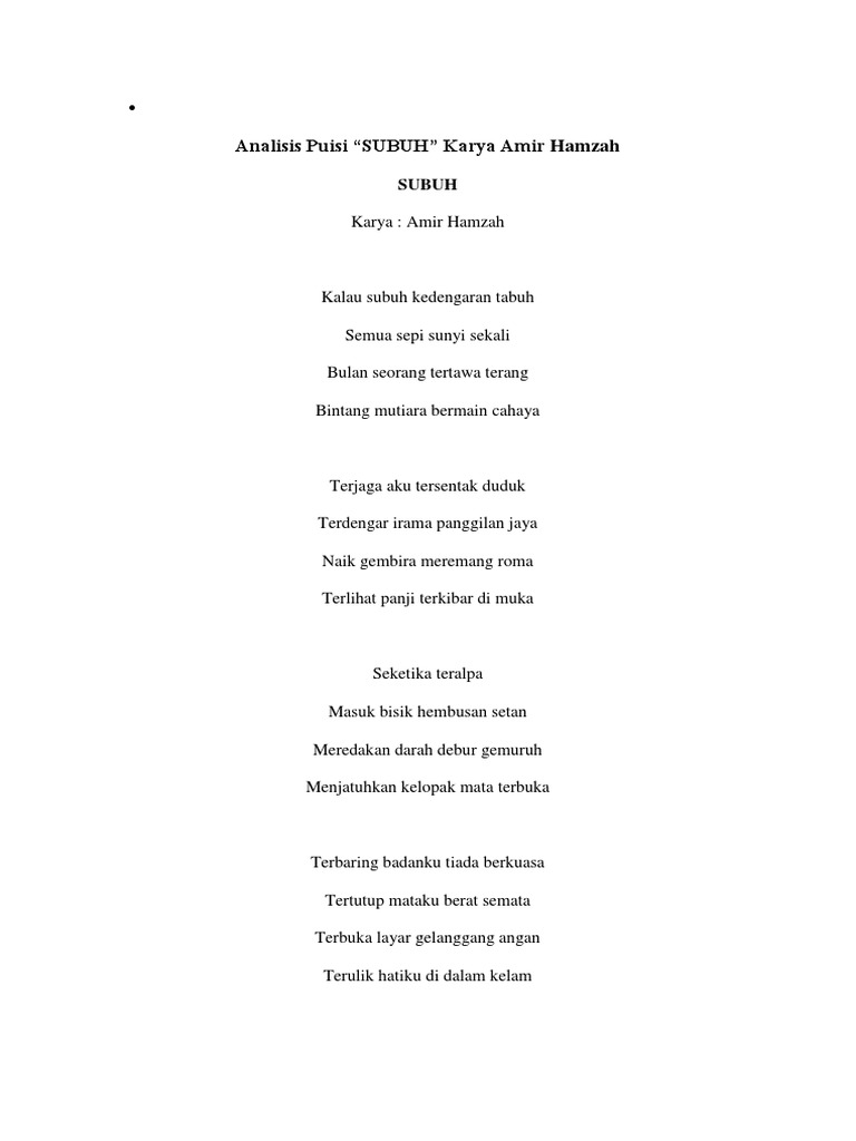 Puisi Subuh Karya Amir Hamzah Tafsir Puisi. Penelitian ini menggunakan metode deskriptif. Admin blog KT Puisi 2019 juga mengumpulkan gambar-gambar lainnya terkait puisi karya amir hamzah beserta maknanya dibawah ini.