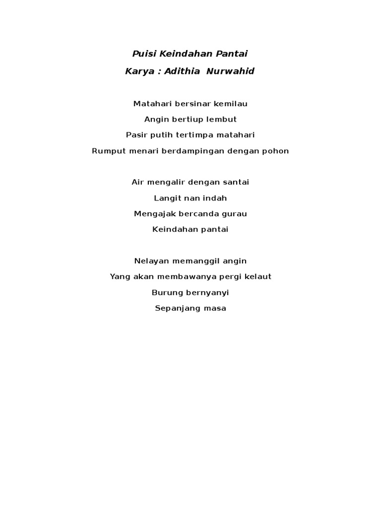 Puisi tentang pantai yang indah menjadi salah satu cara untuk mengapresiasikan kekaguman anda dengan keindahan pantai yang sangat luar biasaDaripada anda harus terus menerus berangan dan kagum dengan keindahan pantai ada baiknya anda tuangkan kekaguman tersebut dengan mengolahnya menjadi kata kata pendek dengan makna yang dalam. Walau sepanjang siang berkejaran terinjak perih. Kini pantai kian menipis terkikis ombak lepas yang semakin ganas.