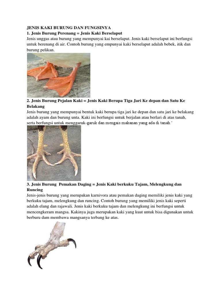Tak hanya mendapatkan pengetahuan tentang bentuk dan fungsi bagian dari burung itu kamu juga bisa mencoba soal latihan yang bisa dikerjakan. Jenis burung yang mempunyai bentuk kaki berupa tiga jari ke depan dan satu jari ke belakang adalah ayam dan burung unta. Macam kaki burung dan fungsinya File.