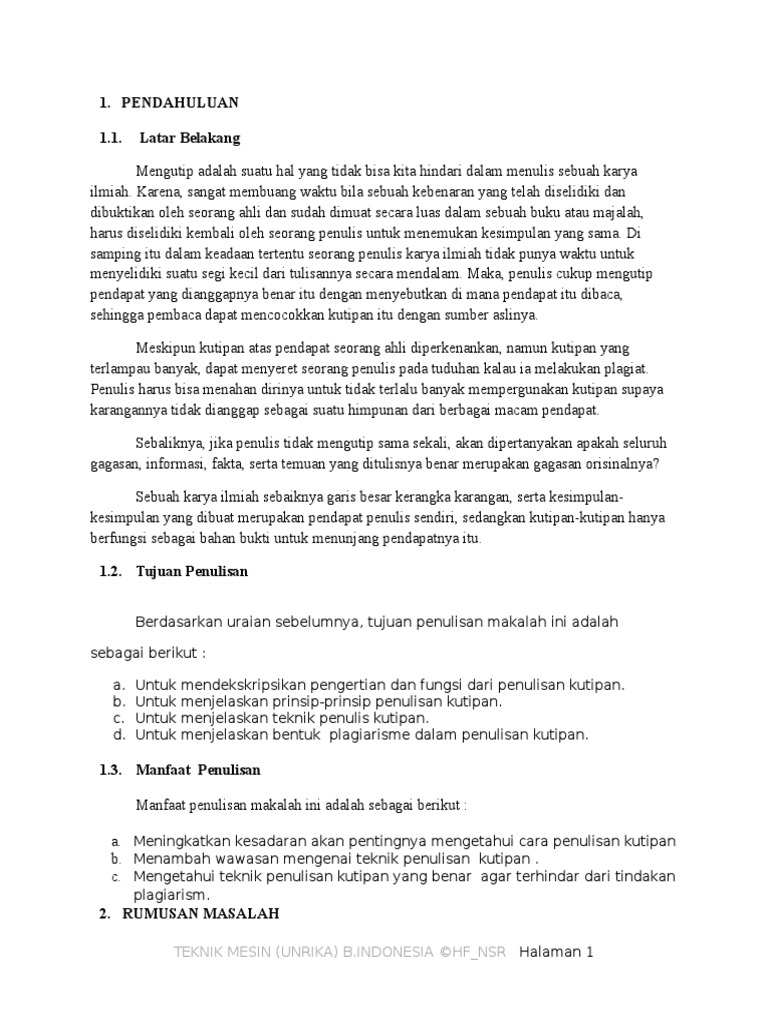 Kutipan selalu ditempatkan pada spasi rapat meskipun kutipan itu singkat saja. Dapat dilakukan dengan dua cara. SERIAL TEKNIK PENULISAN ILMIAH.