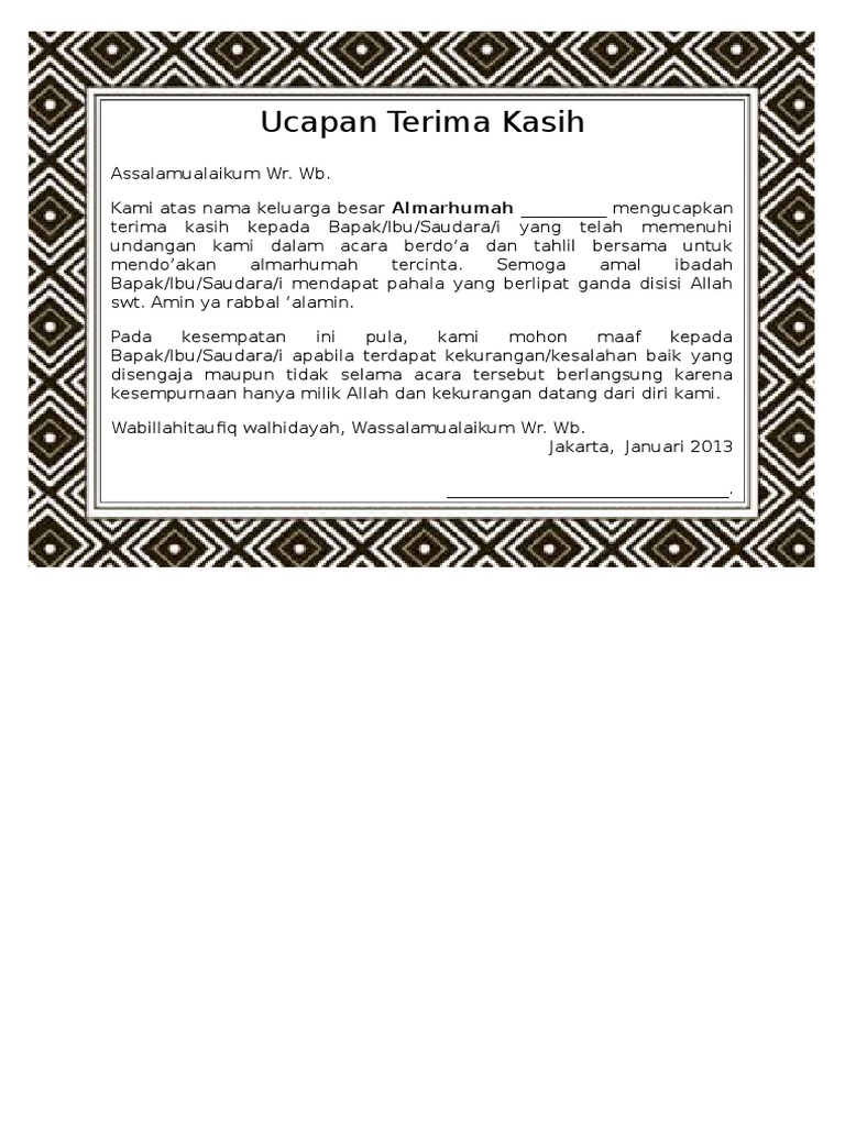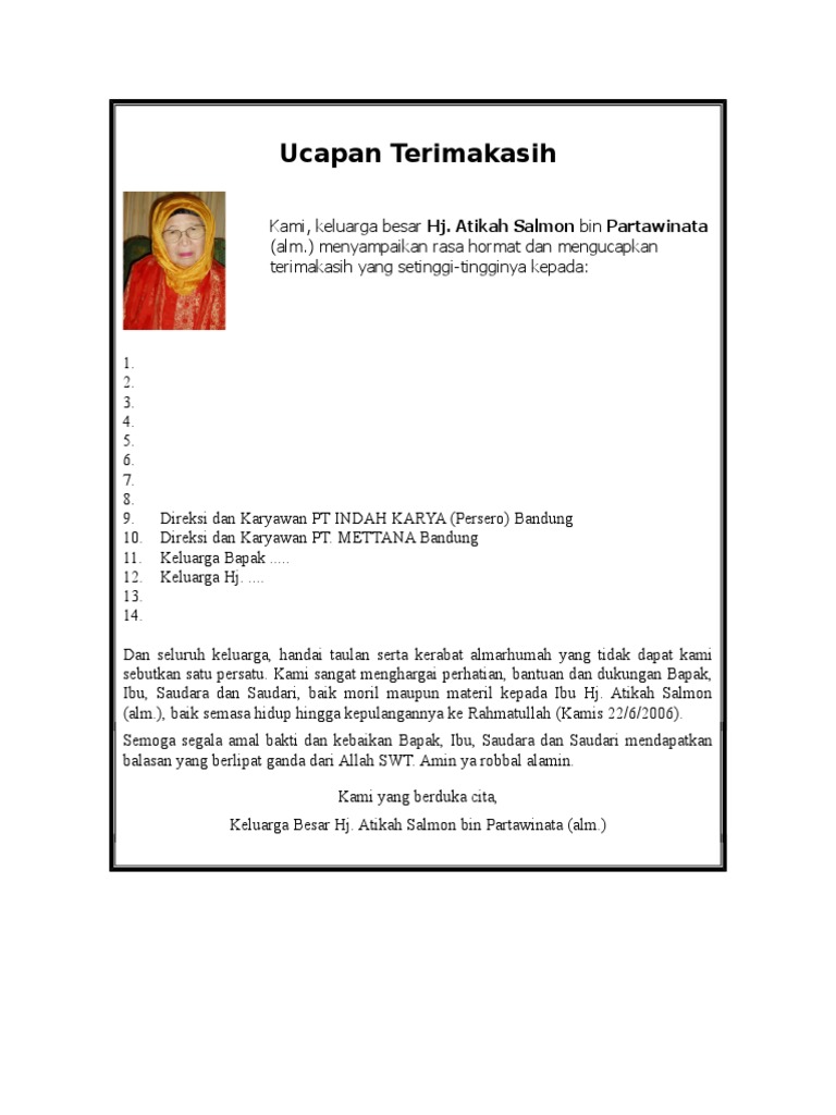 Yanti menyampaikan terima kasih yang sebesar-besarnya kepada. Askin kami mengucapkan terima kasih yang sebesar-besarnya atas ucapan duka cita dan belasungkawa dari segenap pihak on. Jika Anda dekat dengan orang yang diberi ucapan terima kasih jangan ragu untuk memasukkan anekdot atau kisah pribadi dari kehidupan almarhum jika Anda berbagi dengan siapa saja yang diberi ucapan terima kasih.