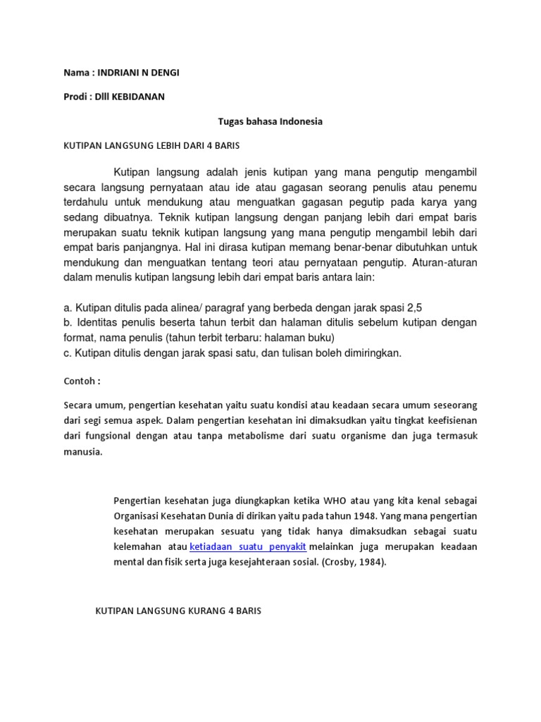Tugas 4 tentang kutipan artikel kesehatan pada catatan kaki. Kutipan langsung pendek kutipan tdk melebihi dari 4 baris kutipan diintegrasikan langsung dalam teks Jarak baris kutipan sama juga dengan jarak baris teks yang ada 2 atau 1½ spasi. 12 Contoh Kutipan Langsung Lebih menurut 4 Baris Terbaru - Dalam pembelajaran Bahasa Indonesia terdapat istilah tentang kutipan pribadi maupun tidak langsungApa itu kutipan pribadi.