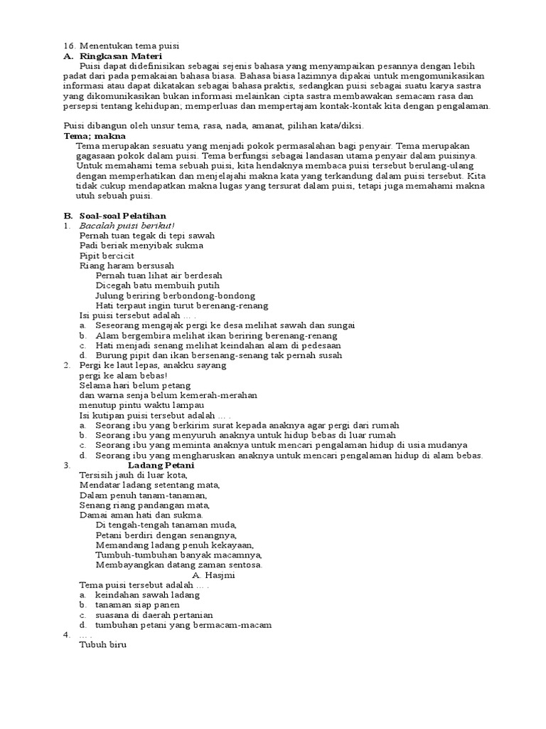 Puisi merupakan suatu bentuk karya sastra yang terikat dengan rima irama serta penyusun bait dan baris dimana bahasanya nampak indah dan penuh makna pada umumnya puisi ini digunakan untuk mengungkapkan isi hati si penyair yang dikemas dengan bahasa imajinatif supaya lebih jelasnya berikut kami berikan beberapa contoh puisi di bawah ini. Jika ia membacakannya tanpa tahu maknanya ia akan sulit menyalurkan perasaan yang terkandung dalam puisi tersebut dengan tepat. Diksi atau pilihan kata yang tepat 2.