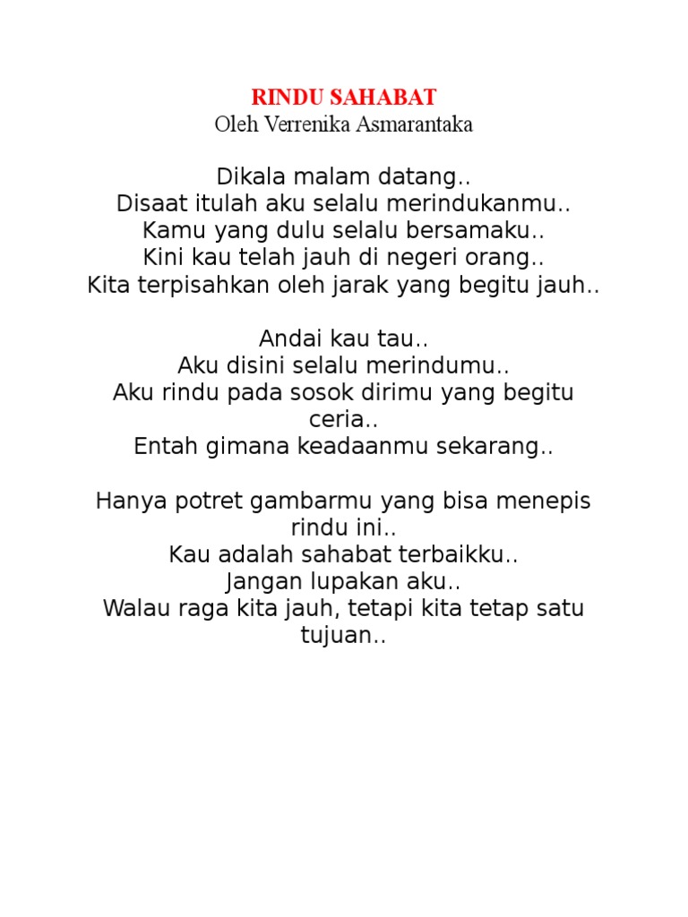 Sepenggal lirik lagu tersebut tentunya sungguh mengingatkan tentang seorang sahabat bukan. Puisi Tentang Rindu sahabat 1 Bait Oleh Kerkuak211016. Untuk mengungkapkan perasaan rindu yang kamu alami kamu bisa mengirimkan puisi untuk sang pujaan hati.