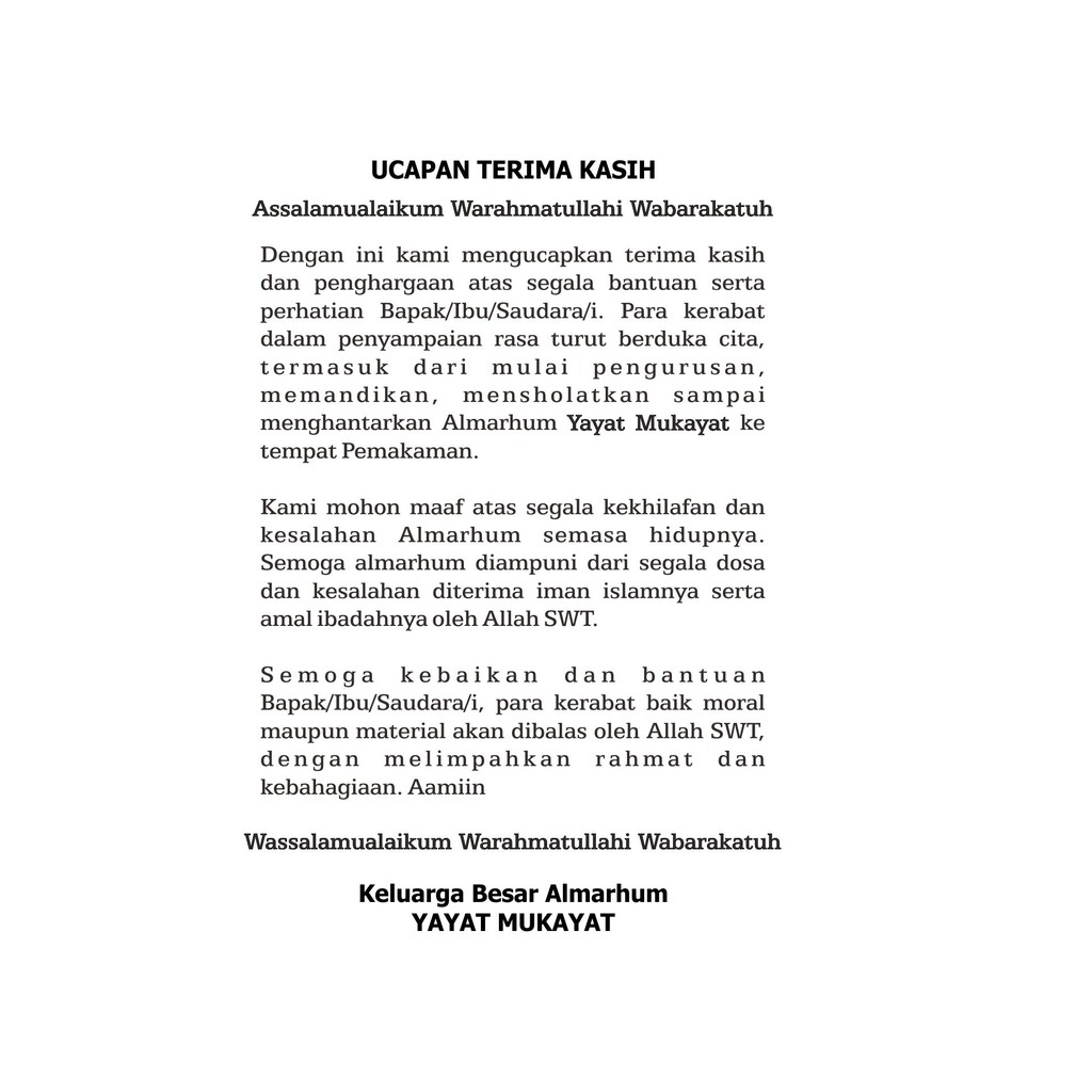 Aamiin ya rabbalalamin 6. Iklan ucapan terima kasih ini biasanya berisi tentang ucapan terimakasih dari pihak keluarga yang berduka kepada semua pihak-pihak yang telah membantu selama proses kedukaan berlangsung termasuk juga ucapan terima kasih kepada pihak keluarga teman relasi bisnis yang mungkin mengucapkan belasungkawa lewat pemasangan iklan ucapan duka. Begitu pun almarhum Ayah Kami Ayah Syahrul yang tepat di bulan suci Ramadan ini Allah SWT telah memanggilnya untuk selama-lamanya.