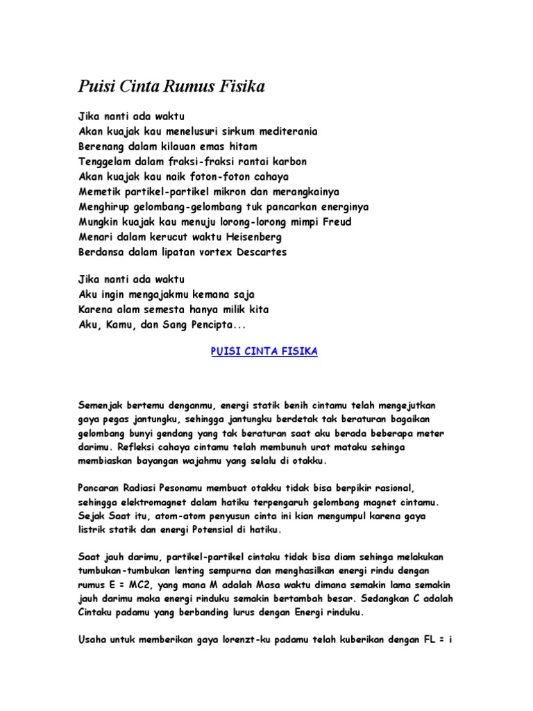 Rumus cinta dalam fisika september 11 2010 adantoro belakangan kata cinta begitu akrap dengan gendang telinga saya dan setiap kali orang membahas soal cinta mereka pasti punya teori yang berbeda berbeda soal cinta. Salah satu keunikan cinta adalah adanya suatu hubungan cinta dengan fisika. Kalo ibaratnya manusia itu adalah universe atau alam semesta lo butuh daya tarik relativitas untuk membuat seseorang tertarik sama lo.