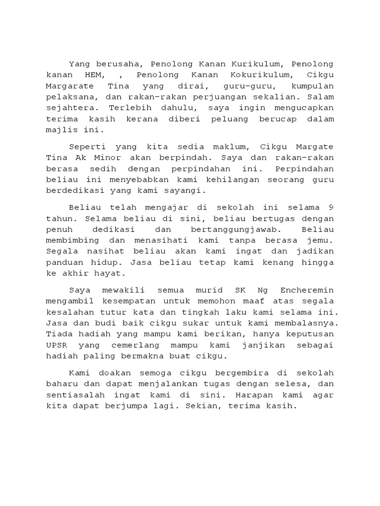 Ucapan perpisahan untuk guru Guruku. Contoh Teks Ucapan Perpisahan Guru. Teks ucapan majlis perpisahan persaraan majlis perpisahan persaraan saya dengan rasminya telah dibuat oleh pihak sekolah menengah kebangsaan sultan ibrahin satu 17000 pasir mas kelantan pada 28 februari 2013 khamis bertempat di dewan besar sekolah yang bermula pada jam 1200 tengah hari hingga jam 200.