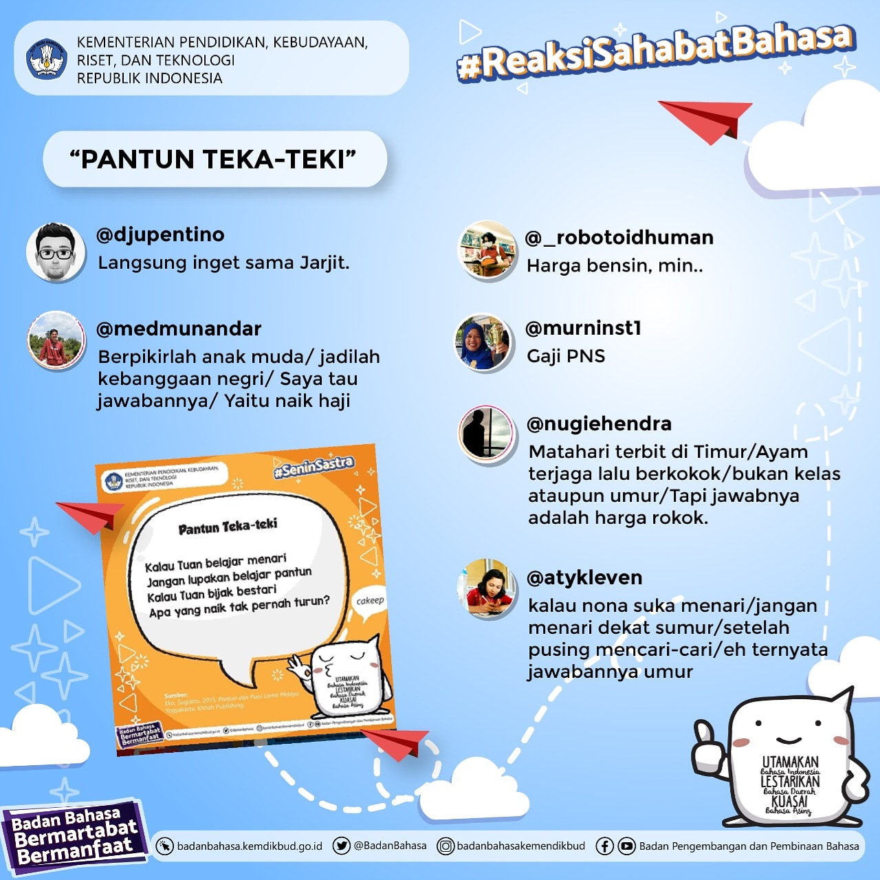 Badan Pengembangan Dan Pembinaan Bahasa On Twitter Halo Sahabatbahasa Dan Sahabatdikbud Konten Ini Berisi Reaksisahabatbahasa Tentang Pantun Teka Teki Bagaimana Pendapatmu Ternyata Jawaban Kalian Sangat Beragam Ya