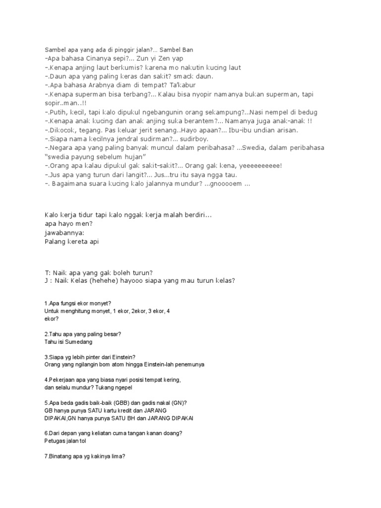 Tebakan receh atau materi yang sederhana justru membuat kamu dan teman-temanmu nggak perlu mikir terlalu berat. Tebak-Tebakan Receh Garing. Pintu apa yang walaupun didorong sepuluh orang pun tidak terbuka.