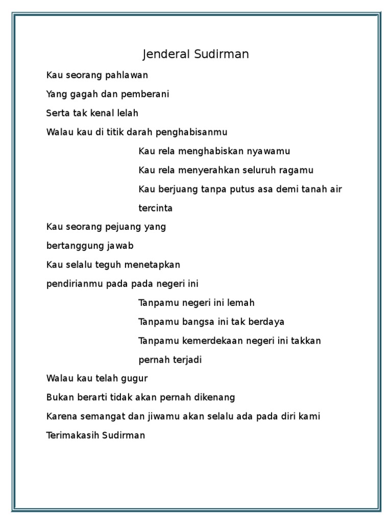 Beliau dengan gagahnya dan berani pantang menyerah melawan penjajah untuk memperjuangkan kemerdekaan Indonesia. Kemerdekaan ini adalah keringat. Menyusun puisi bisa bertema kemerdekaan bisa menjadi satu di antara cara untuk memeriahkan hari kemerdekaan.