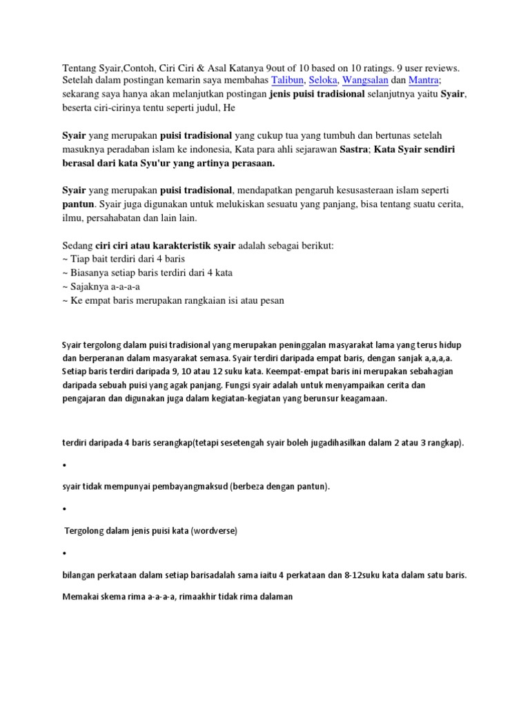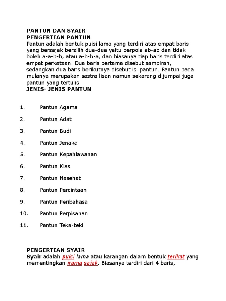 Pantun adalah bentuk puisi Indonesia Melayu tiap bait kuplet biasanya terdiri atas empat baris yang bersajak a-b-a-b tiap larik biasanya terdiri atas empat kata baris pertama dan baris kedua biasanya untuk tumpuan sampiran saja dan baris ketiga dan keempat merupakan isiPada teks di atas puisi yang terdiri dari empat baris dan memiliki ciri-ciri adalah. Ilmu didapat tiada cepat Mesti sabar hatinya kuat Semoga tuhan berikan rahmat Maka jaga hati serta niat.