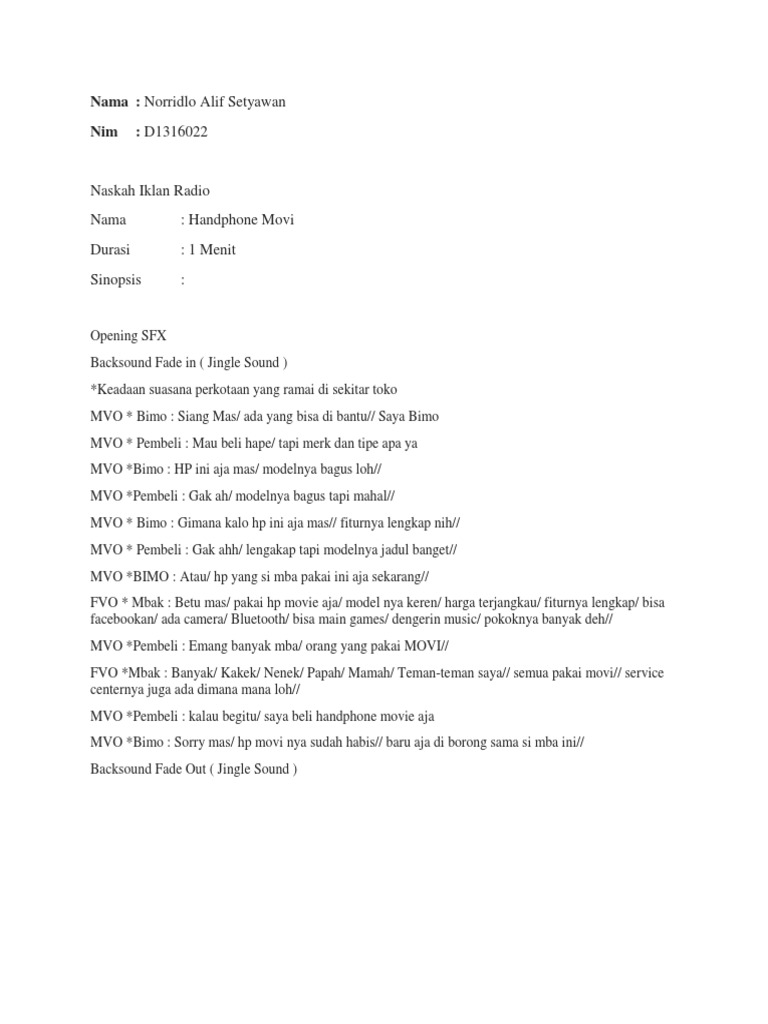 Script Iklan Radio. Axis Client/Klien Product/Produk Brand/Merk Length/Waktu Date/Tanggal : : : : : PT. Natrindo Phone Sim Card GSM Axis 60. ... Contoh Script Radio. Suci Yuanisa. script iklan layanan masyarakat. FitrianaKristianti. Contoh Story Board Iklan TV 30. andidannisa. Contoh Naskah Radio. 6