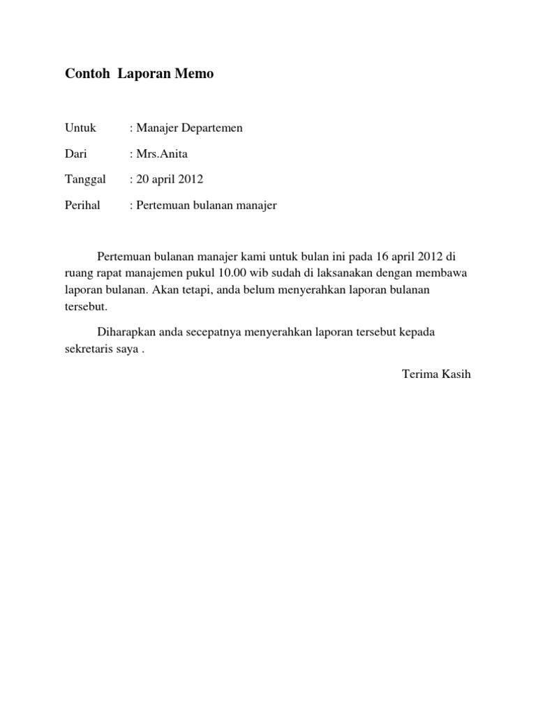 Contoh Laporan Memo. Untuk Dari Tanggal Perihal: Manajer Departemen : Mrs.Anita : 20 april 2012 : Pertemuan bulanan manajer. Pertemuan bulanan manajer kami untuk bulan ini pada 16 april 2012 di ruang rapat manajemen pukul 10.00 wib sudah di laksanakan dengan membawa laporan bulanan. Akan tetapi, anda belum menyerahkan laporan … 5