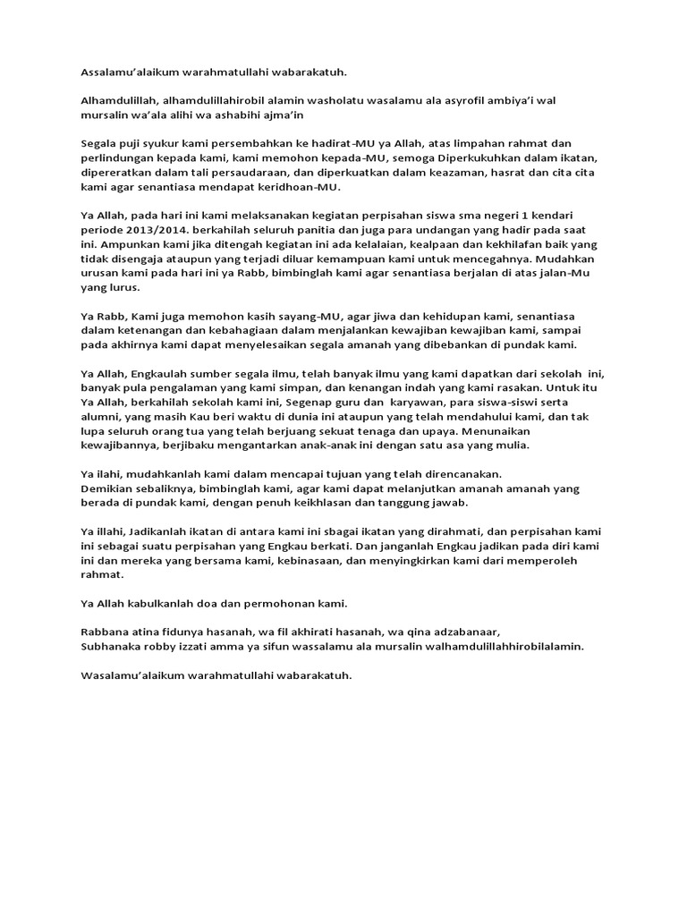 Teks Doa Perpisahan [on2303y3jjl0]. ... Assalamu’alaikum warahmatullahi wabarakatuh. Alhamdulillah, alhamdulillahirobil alamin washolatu wasalamu ala asyrofil ambiya’i wal mursalin wa’ala alihi wa ashabihi ajma’in Segala puji syukur kami … 2