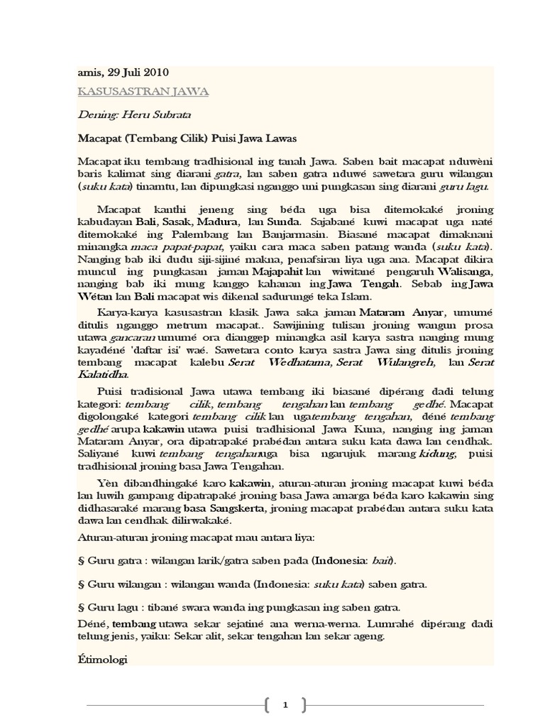 Nov 04, 2021 · Ing jaman biyen diarani puisi jawa kuna utawa puisi jawa gagrag lawas . Geguritan gagrak anyar uga diarani puisi jawa model anyar, ora kaiket dening patokan kaya geguritan gagrak lawas,titikane gagrak anyar :. Geguritan atau dalam hal ini puisi jawa … 2