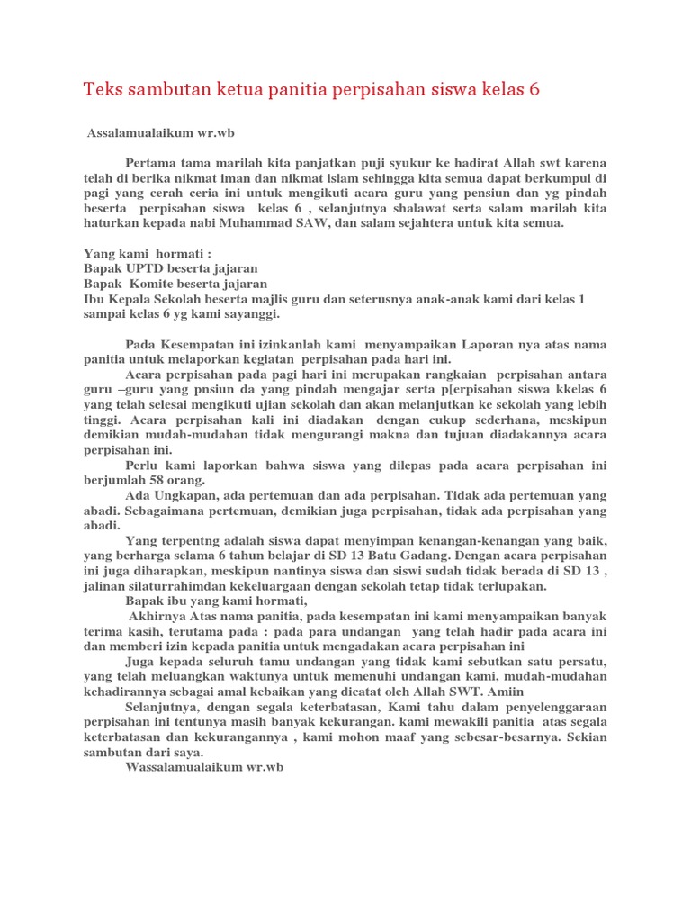 May 15, 2019 · Kata Sambutan Ketua Panitia Acara Perpisahan Sekolah. Assalamu’alaikum wr wb. Segala puji milik Allah SWT, yang telah memberikan kepada kita nikmat yang melimpah, diantara … 8
