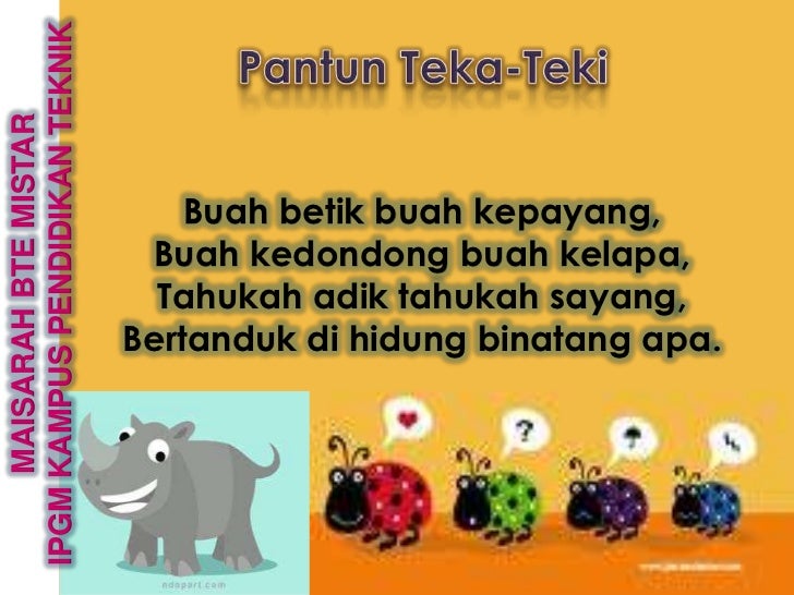 May 31, 2022 · Pantun teka teki ini bertujuan mengasah bakat anak-anak sambil belajar berfikir untuk meningkatkan ilmu. tekatekipantun.suapan tajuk. Jumaat, 11 Februari 2011. TEKA-TEKI NAMA BINATANG … Waktu malam matanya terang. … 2