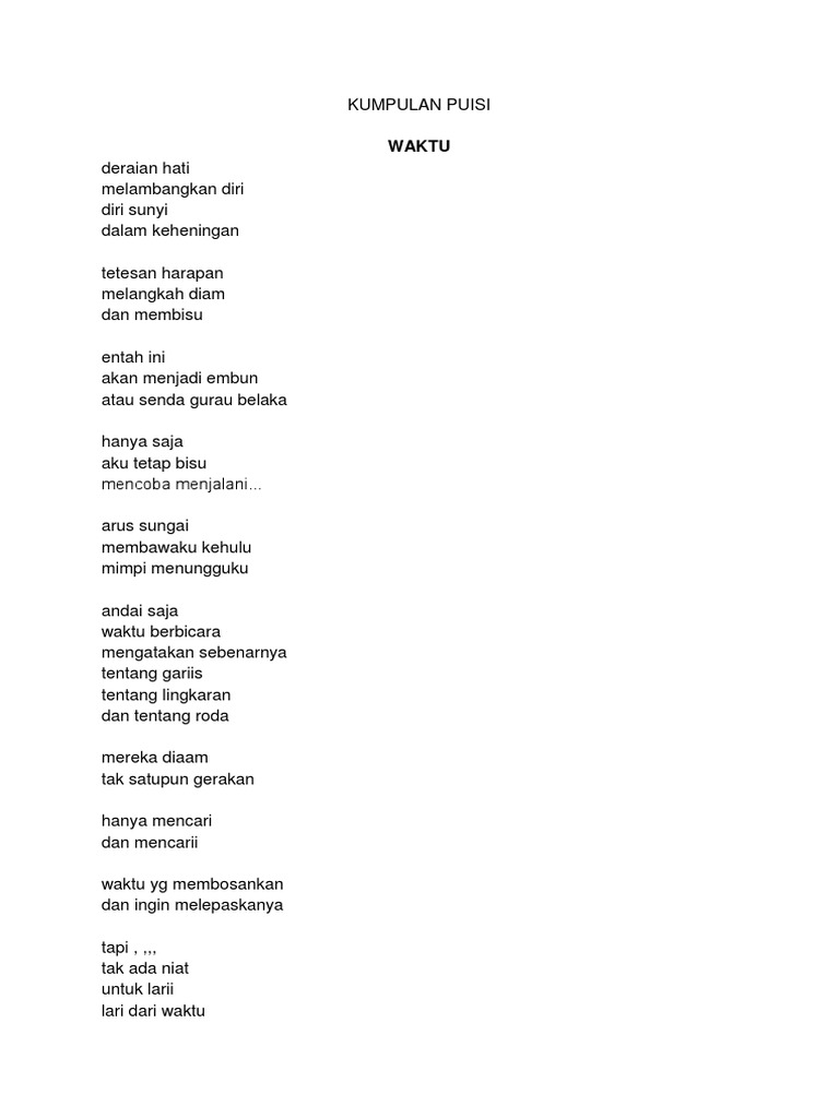 Oct 29, 2022 · Sebagai salah satu karya sastra, puisi bisa menjadi indah dan mengesankan didukung oleh beberapa faktor, salah satunya adalah pilihan kata. Pilihan kata dalam puisi … 10