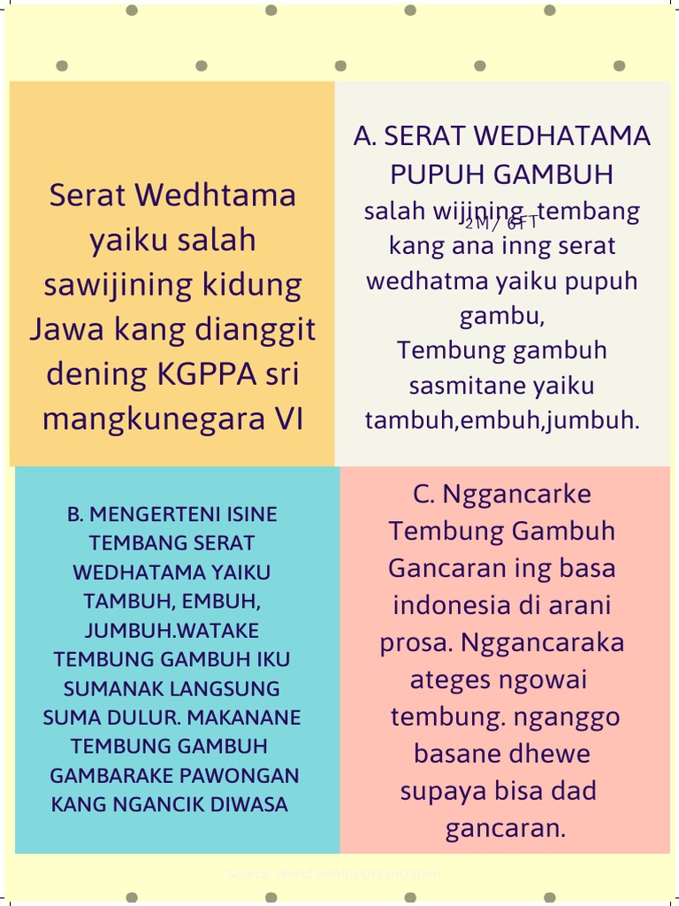 Play this game to review World Languages. Ing sandiwara bahasa Jawa iku sing kudu digatekake sakliyane dialog yaiku pilihan tembung. Pilihan tembung iku uga diarani..... Preview this quiz on Quizizz. Quiz. teks sandiwara. DRAFT. 9th grade … 1